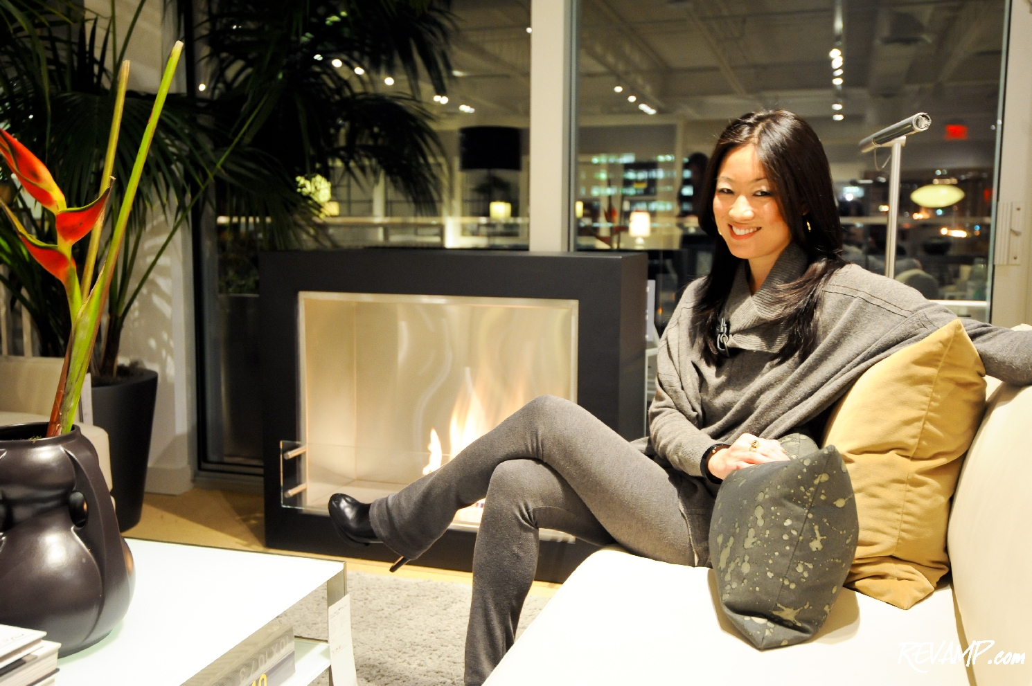 Pamela's Punch's Pamela Sorensen enjoys the warm glow emanating from one of Room & Board's new EcoSmart fireplaces.